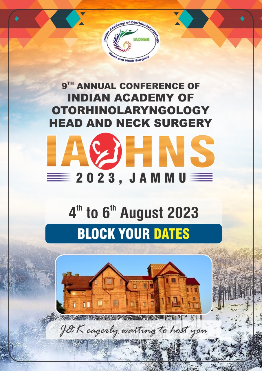 It fills us with an immense pleasure in announcing the formal launch of our upcoming conference "9th Annual Conference of INDIAN ACADEMY OF OTORHINOLARYNGOLOGY HEAD AND NECK SURGERY (IAOHNS) 2023 to be held from 4th-6th August 2023 at Jammu Kashmir, India.